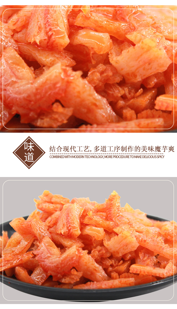 ผลิตจากบุกก้อนธรรมชาติแปรรูปแบบหยัก แคลอรี่ต่ำ  เนื้อสัมผัสกรุบกรอบคล้ายแมงกระพรุน